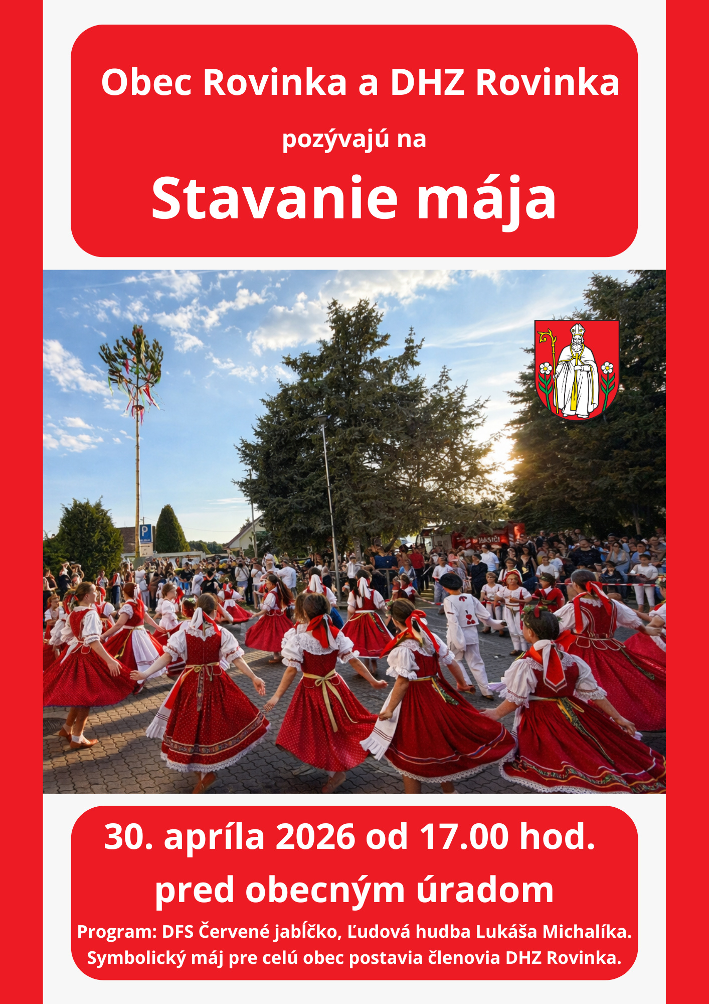 Príďte si spolu s nami užiť príjemné popoludnie s folklórnou atmosférou, hudbou a tradíciami. O program sa postará DFS Červené jabĺčko a Ľudová hudba Lukáša Michalíka. Symbolický máj pre celú obec postavia členovia DHZ Rovinka.