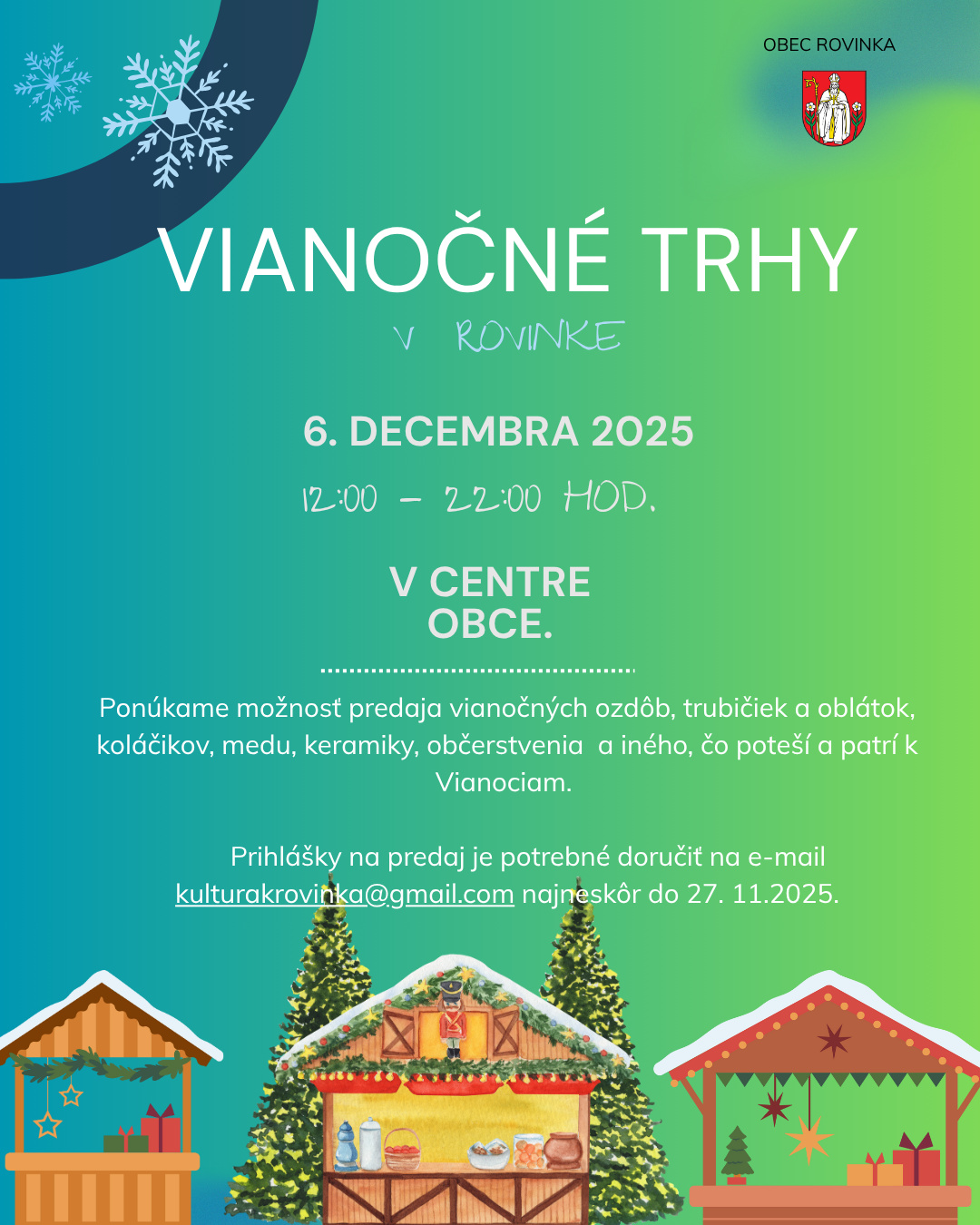 Obec Rovinka pozýva na Vianočné trhy, ktoré sa budú konať 6. decembra 2025 od 12.00 do 22.00 hod. v centre obce za obecným úradom.